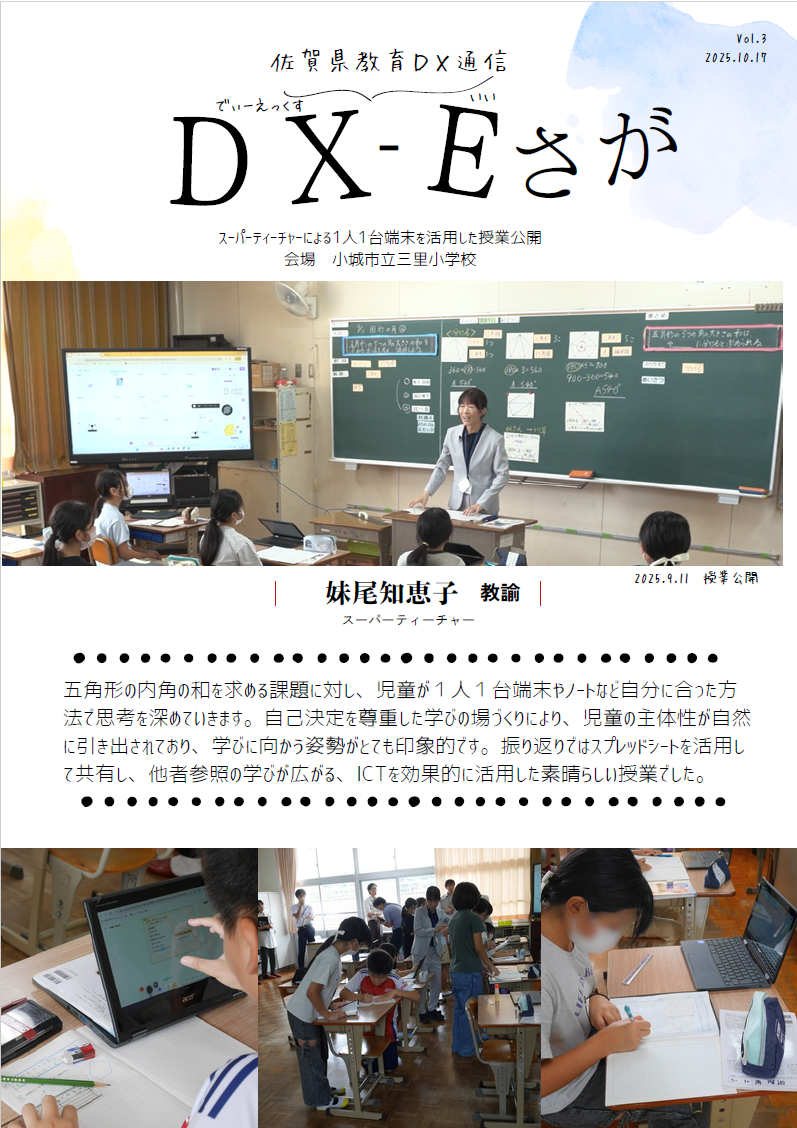 五角形の内角の和を求める課題に対し、児童が1人1台端末やノートなど自分に合った方法で思考を深めていきます。自己決定を尊重した学びの場づくりにより、児童の主体性が自然に引き出されており、学びに向かう姿勢がとても印象的です。振り返りではスプレッドシートを活用して共有し、他者参照の学びが広がる、ICTを効果的に活用した素晴らしい授業でした。