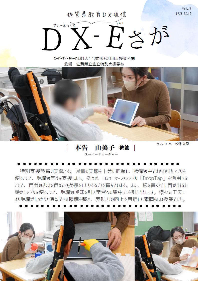 特別支援教育の実践です。児童の実態を十分に把握し、授業の中ではさまざまなアプリを使うことで、児童の学びを支援します。例えば、コミュニケーションアプリ「DropTap」を活用することで、自分の思いを伝えたり挨拶をしたりする力を育んでいます。また、線を書くときに音が出るお絵かきアプリを使うことで、児童の興味を引き学習への集中力を引き出します。様々な工夫により児童がしっかりと活動できる環境を整え、表現力の向上を目指した素晴らしい授業でした。