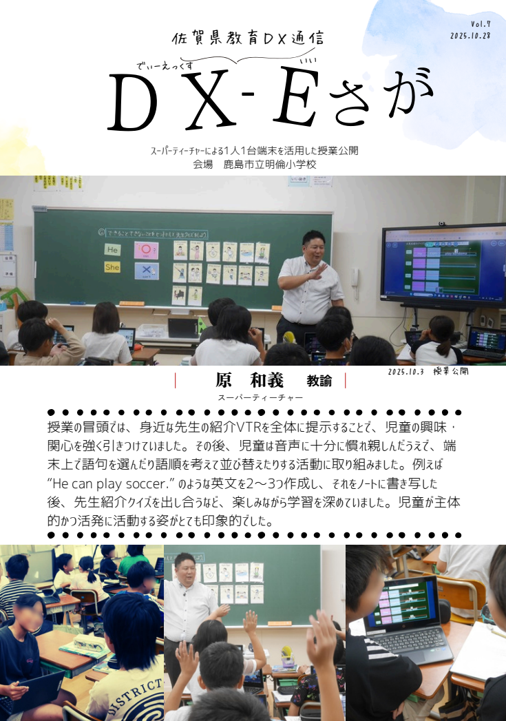 授業の冒頭では、身近な先生の紹介VTRを全体に提示することで、児童の興味・関心を強く引きつけていました。その後、児童は音声に十分に慣れ親しんだうえで、端末上で語句を選んだり語順を考えて並び替えたりする活動に取り組みました。例えば“He can play soccer.” のような英文を2~3つ作成し、それをノートに書き写した後、先生紹介クイズを出し合うなど、楽しみながら学習を深めていました。児童が主体的かつ活発に活動する姿がとても印象的でした。